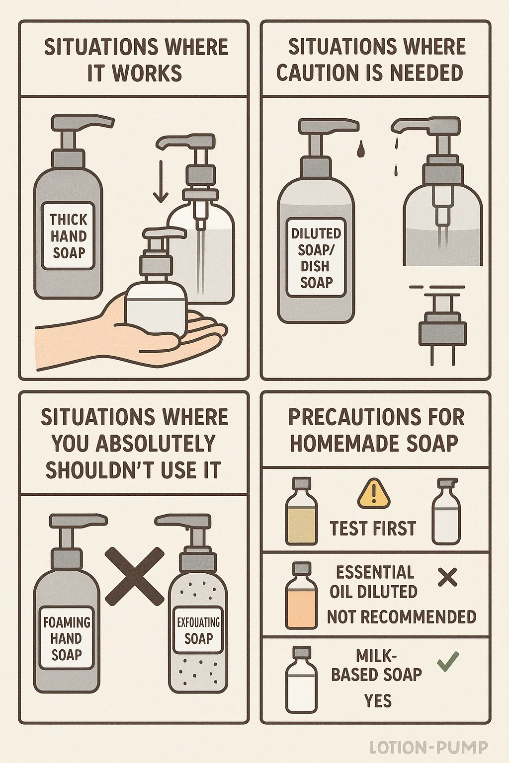 | Sæbe type | Arbejder i Lotion Pump? | Nøgletrin |