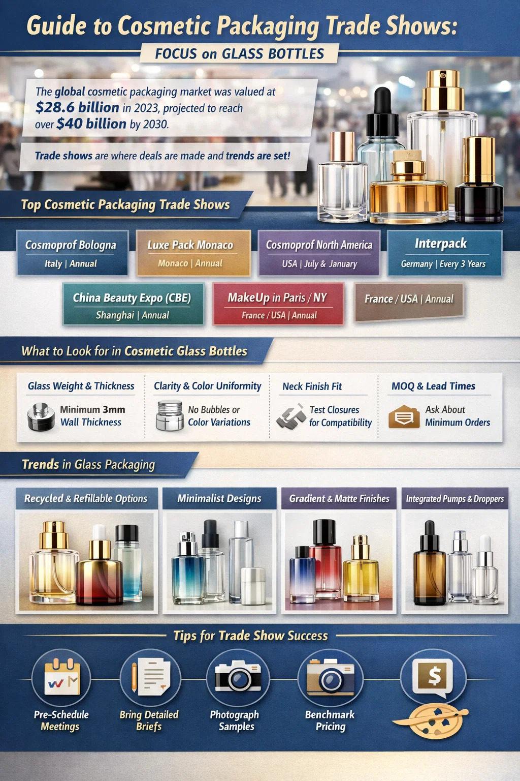 Hvis du køber emballage til kosmetiske produkter - især premium materialer som kosmetiske glasflasker — at deltage i de rigtige messer er en af de mest effektive beslutninger, du kan træffe. På et enkelt sted kan du sammenligne hundredvis af leverandører, håndtere fysiske prøver, forhandle priser direkte og opbygge relationer, som det tager måneder at replikere via e-mail. Det globale marked for kosmetisk emballage blev vurderet til ca 28,6 milliarder dollars i 2023 og forventes at nå over $40 milliarder i 2030, ifølge Grand View Research. Messer er, hvor en betydelig del af dette marked formes - aftaler indgås, tendenser sættes, og leverandørnetværk opbygges.