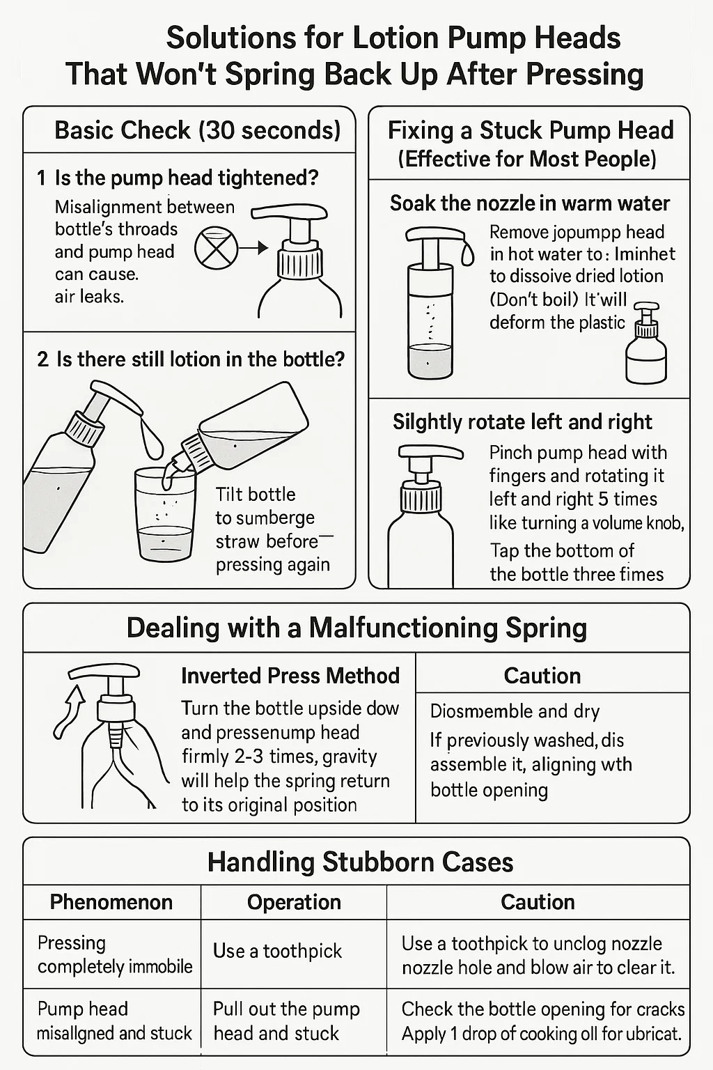 Inverteret pressemetode: Vend flasken på hovedet og tryk pumpehovedet fast 2-3 gange. Tyngdekraften vil hjælpe fjederen tilbage til sin oprindelige position. Demonter og tør: Hvis den er vasket tidligere, skal fjederen skilles ad og tørres af (våde fjedre ruster hurtigt).