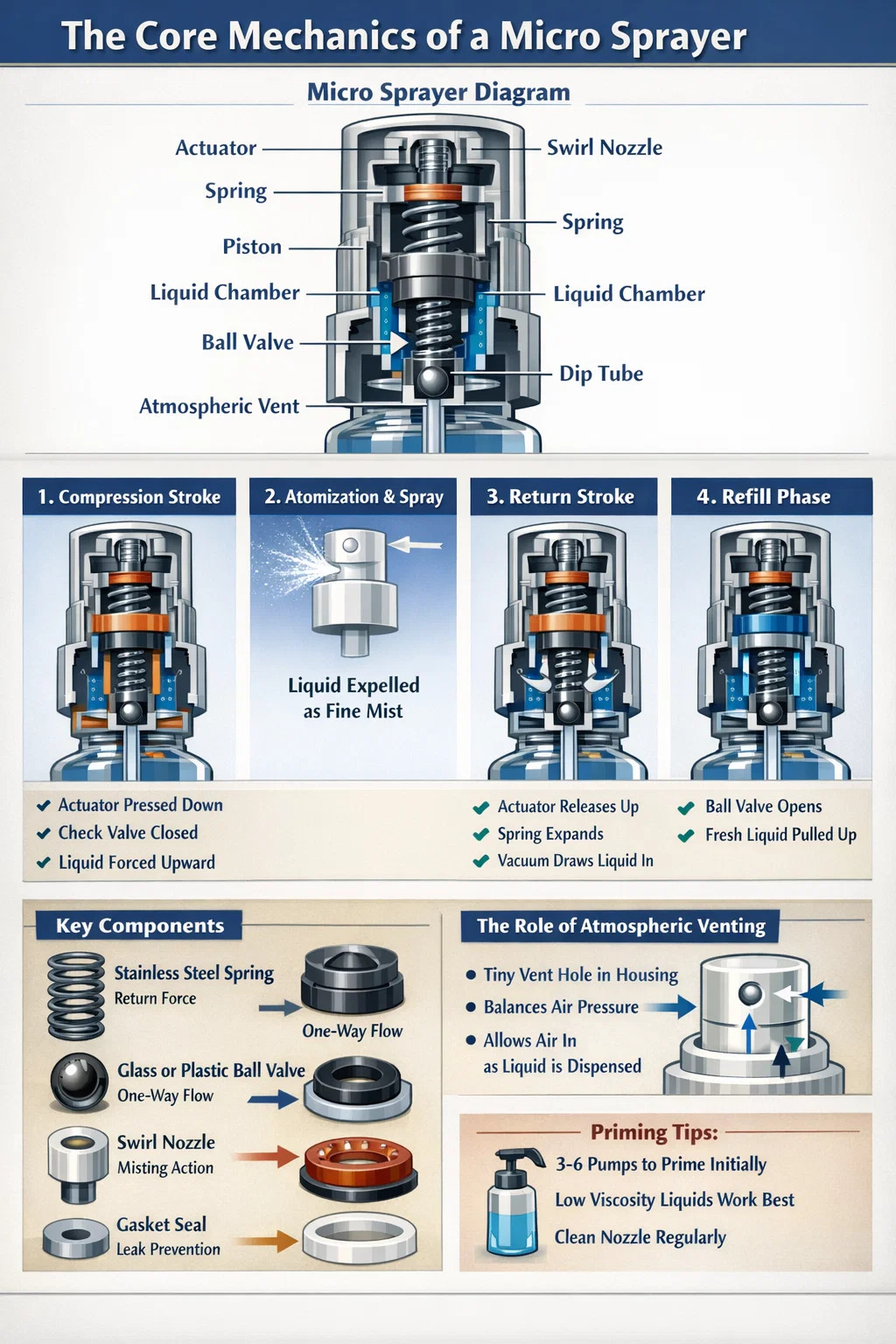 Det grundlæggende arbejdsprincippet for en mikrosprøjte er baseret på forskydning af væske og atmosfærisk tryk, specifikt ved hjælp af en positiv fortrængningspumpemekanisme . Når aktuatoren trykkes ned, komprimerer den en fjeder og reducerer volumen inde i et lille kammer, hvilket tvinger væske ud gennem en præcisionsdyse. Ved frigørelse trækker fjederen stemplet tilbage, hvilket skaber en vakuum der trækker frisk væske fra flasken gennem dypperøret for at genopfylde kammeret til næste spray.